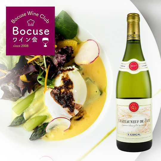 ローヌ地方の名高いワイン名産地「シャトーヌフ・ド・パプ」の白ワイン。パールがかった金色の輝く色調。ゆったりと白い花の香りが感じられます。口に含むと、とろりとした果肉感があり、ほどよい酸味で上品な味わいです。