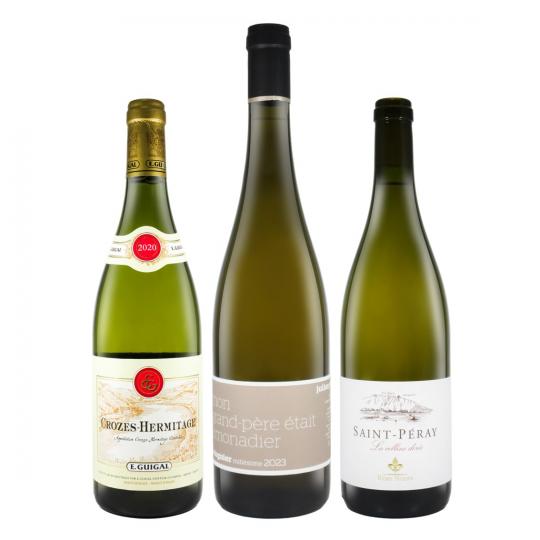 北ローヌの実力派生産者3人による白ワインセット。歴史と革新を両立するギガル、若き才能ジュリアン・ピロン、伝統と自然を守るレミー・ノダン。個性が際立つ3本セットです。