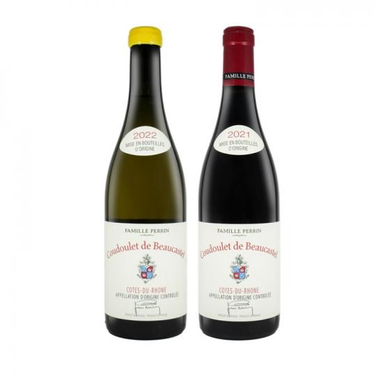 南ローヌの名門シャトー・ド・ボーカステルが手掛ける「Coudoulet de Beaucastel」。白は爽やかな果実味と酸が特徴で魚介料理と好相性。赤は凝縮した果実味とスパイシーさがあり、肉料理や煮込みに最適です。南仏のテロワールを感じる贅沢な味わいを楽しめるセットです。